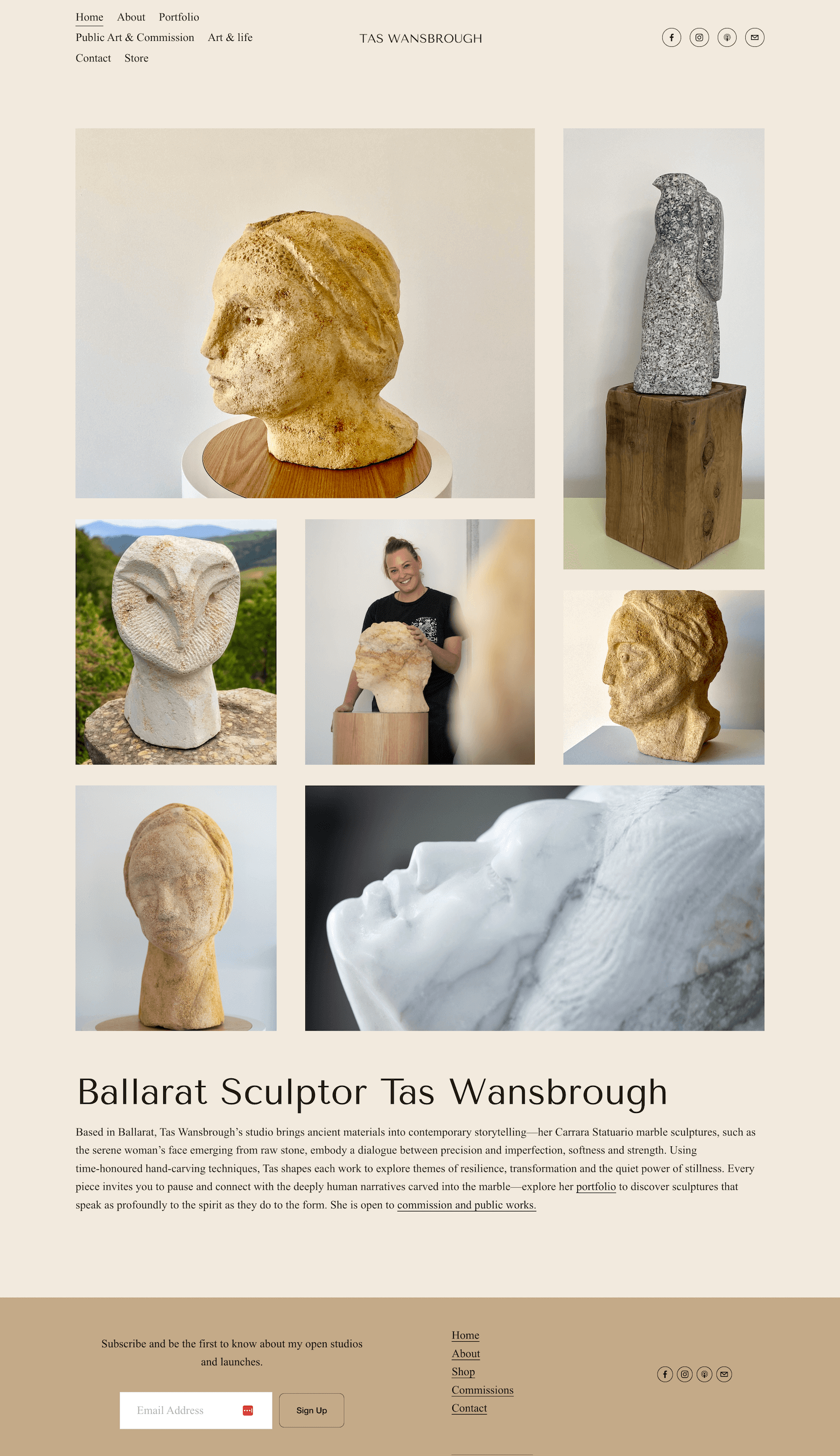 Tas Wansbrough is a Ballarat-based sculptor whose work explores resilience, stillness, and human narrative through hand-carved stone. She needed a minimalist, spacious online portfolio to showcase her sculptures while allowing the texture and form of her work to speak for itself. I designed a custom Squarespace website with a neutral palette, elegant typography, and a gallery-focused layout to support her storytelling.